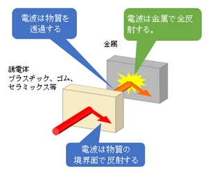 ミリ波は誘電体の内部に透過する特徴があります。建物の中で携帯電話が使用できるのはこの特徴によるものです。また、透過する際、その境界面で一部は反射します。