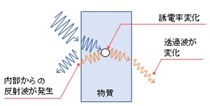 物体内部に誘電率が異なる部位が存在した場合も、その境界面で一部は反射し一部は透過します。また、誘電体の内部では、その誘電率に応じた波長に変化し、その結果振幅と位相に差異が生じます。これらの情報を利用して、物質内部の検査を行います。