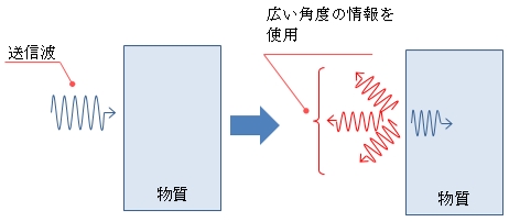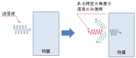 通常の電磁波レーダーは送信波と同じ方向に反射した信号を使用します。そのため、空間分解能はアンテナの指向性で決まります。