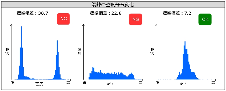 このグラフは密度をヒストグラムにしたもので、左から、混錬前、混錬途中、混錬後に対応しています。
