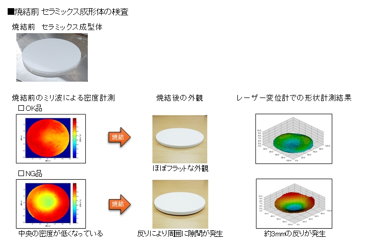 グリーンシートの状態で密度のバラツキが把握できれば、焼結前に変形してしまうことが分かります。事前にわかれば、焼く前に再度成型しなおすことで材料、エネルギー、作業工数を無駄にすることなく再利用することが可能です。